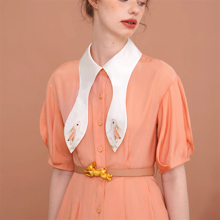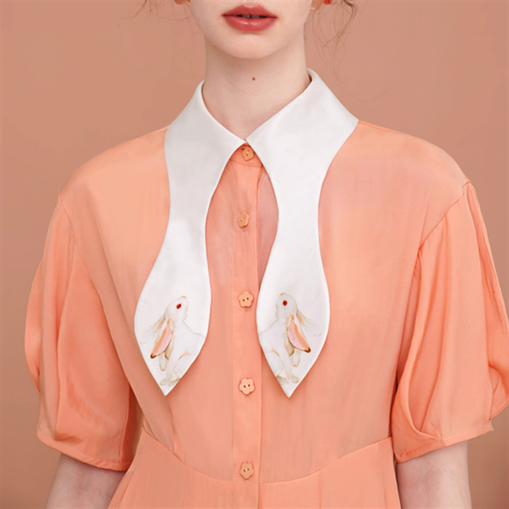 ウサ耳シルエットの襟にウサギのイラストがキュートなロングワンピースです。