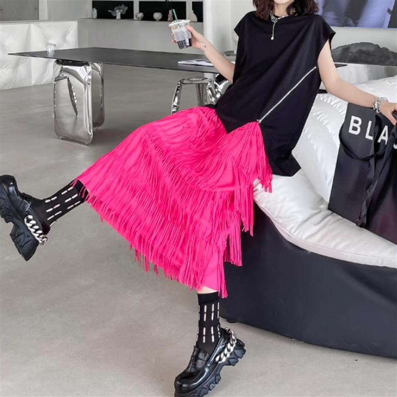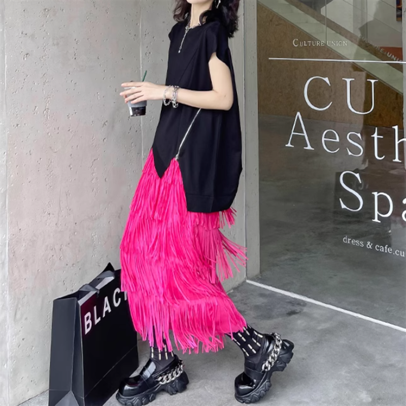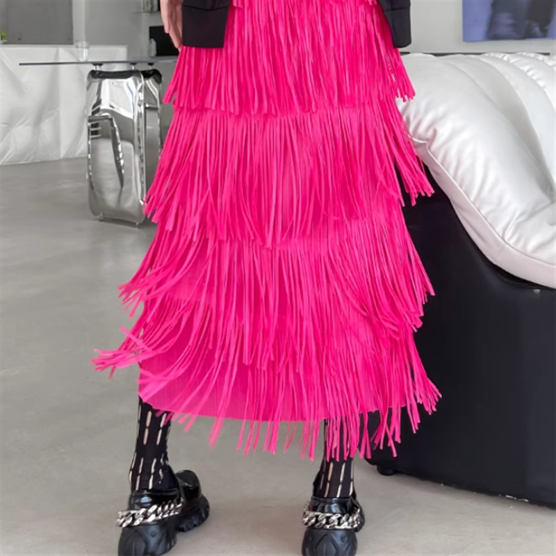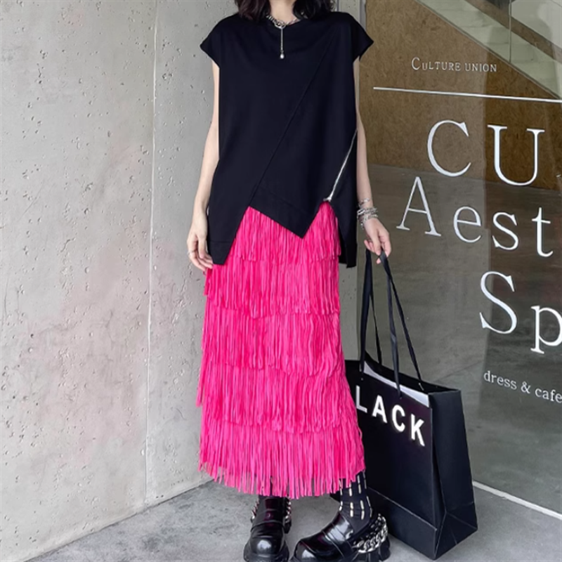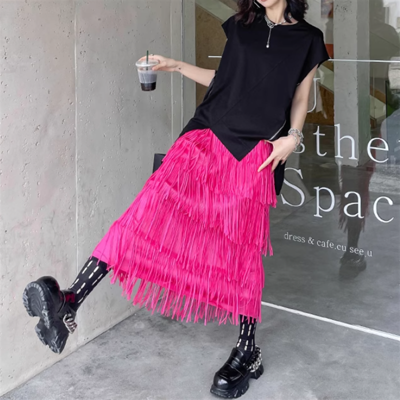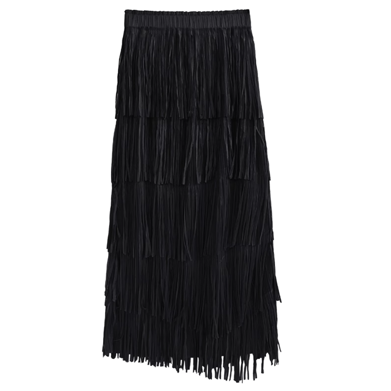 ティアードデザインでボリューム感のあるフリンジが魅力的なロングスカートです。