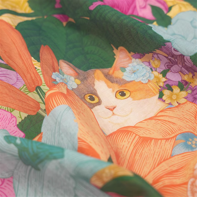 鮮やかなお花にこっそりと隠れたネコがキュートなプリントのミモレ丈スカートです。