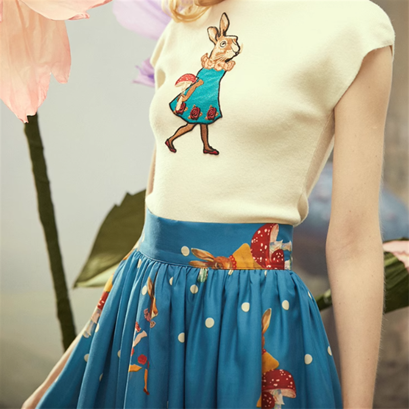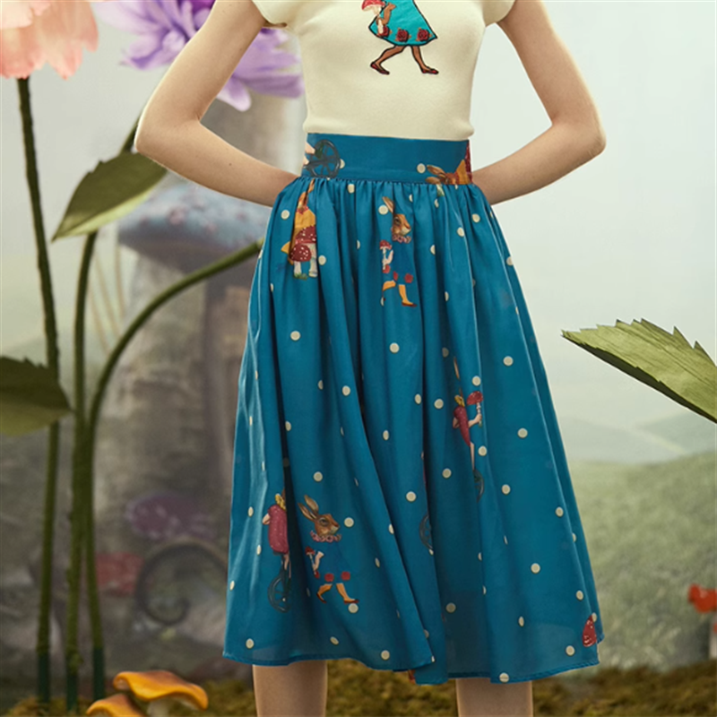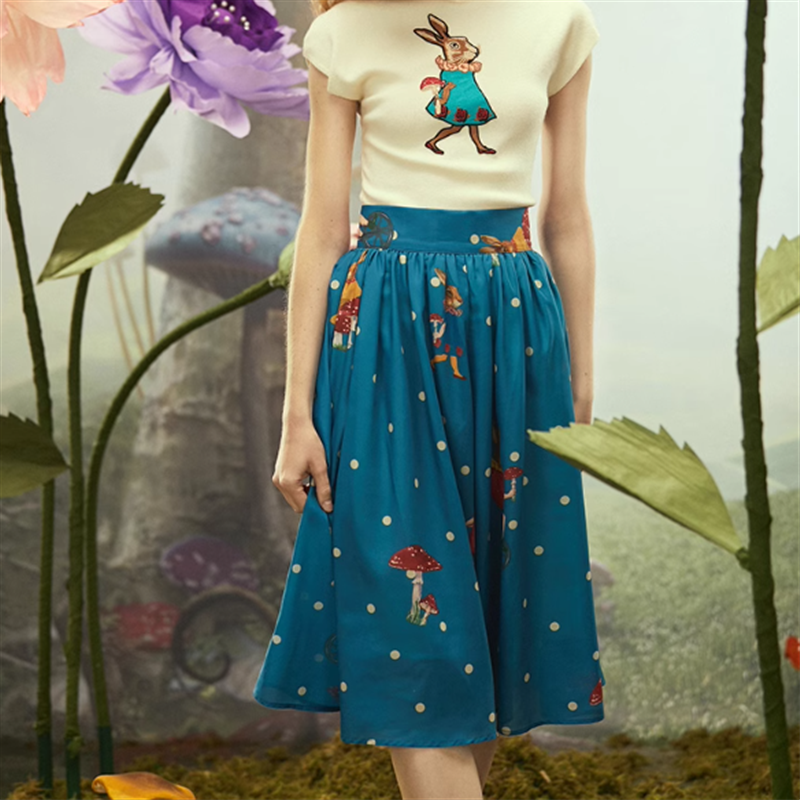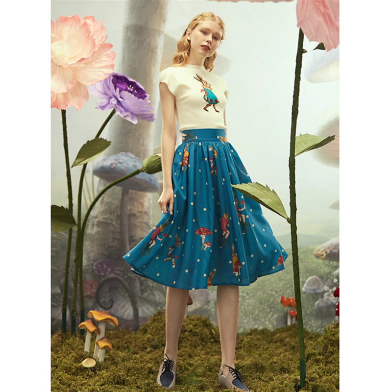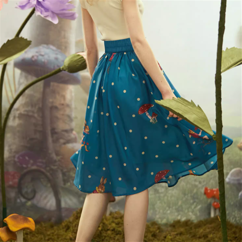 小さなドットにウサギやキノコのプリントがレトロ可愛いスカートです。