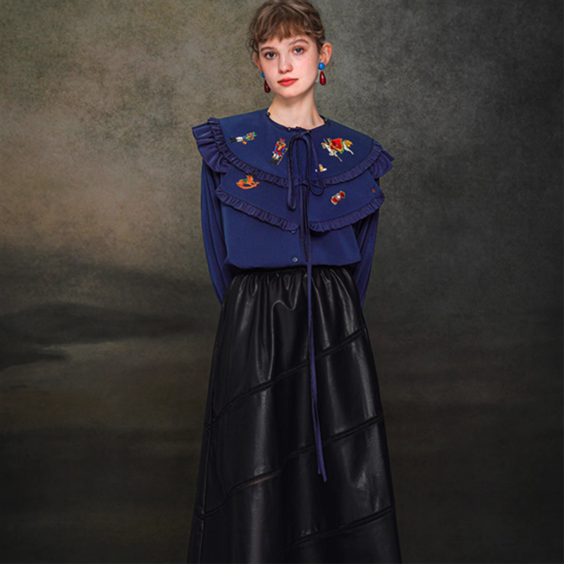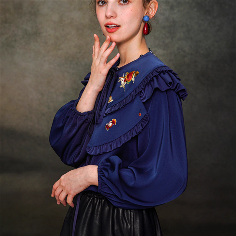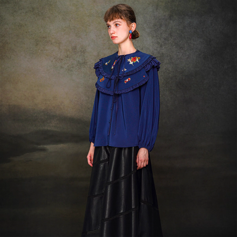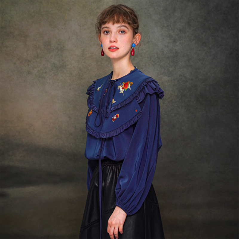 【Camoooni】レトロ刺繍ビッグカラーブラウス 10831