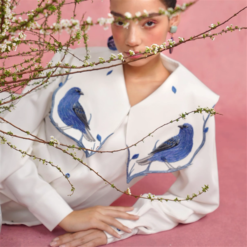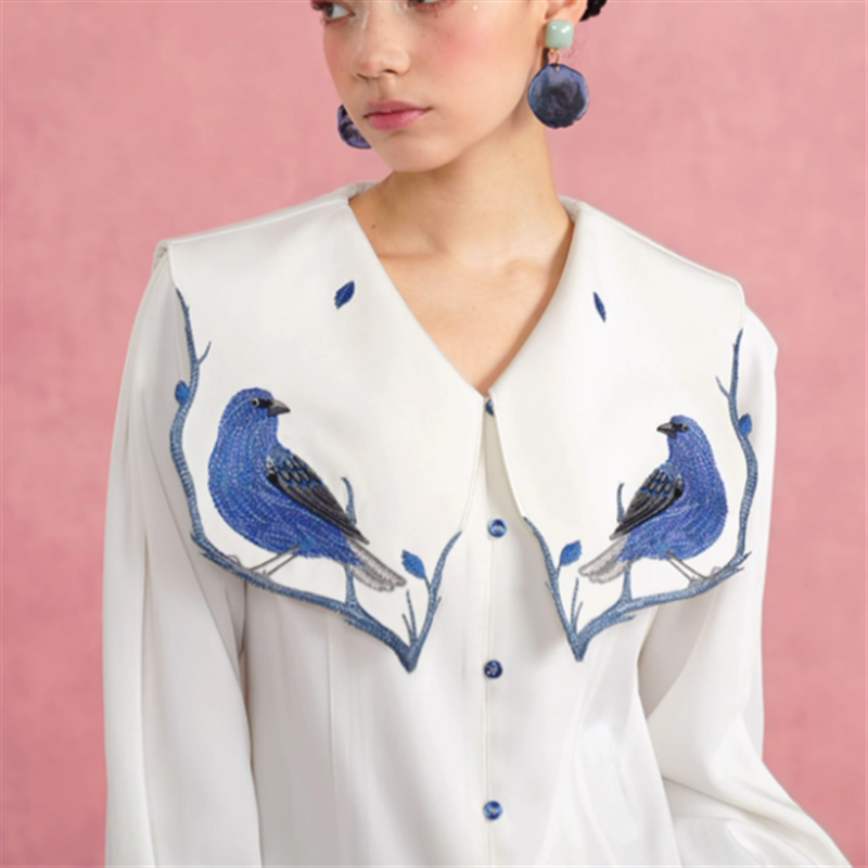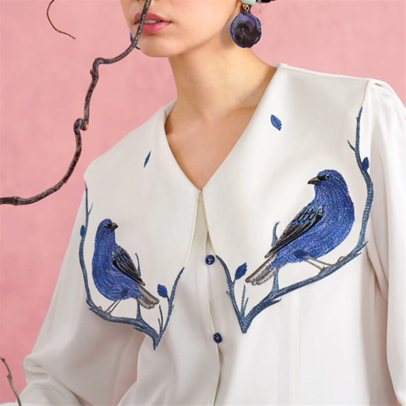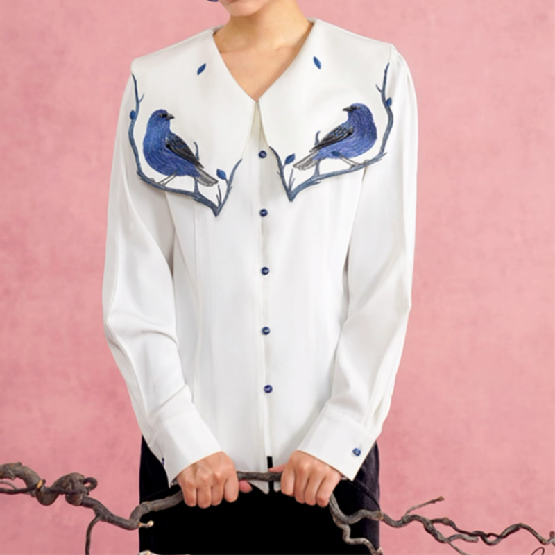スタイリングに華を添える青い鳥の刺繍が美しいビックカラーブラウスです。