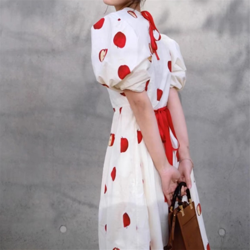 真っ赤なリンゴ柄がとびきりキュートなワンピースです。