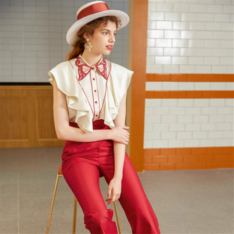 蝶をデザインした襟が印象的なノースリーブブラウスです。