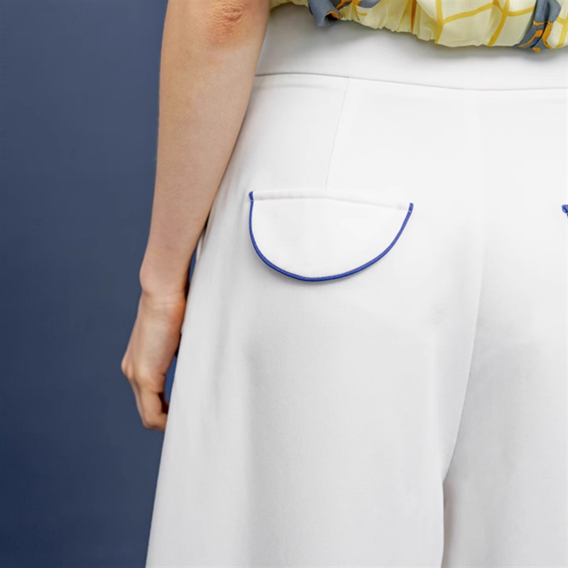 ポケットやサイドにラインを入れ、裾にはステッチでアクセントを加えたデザインパンツ。