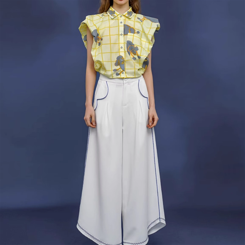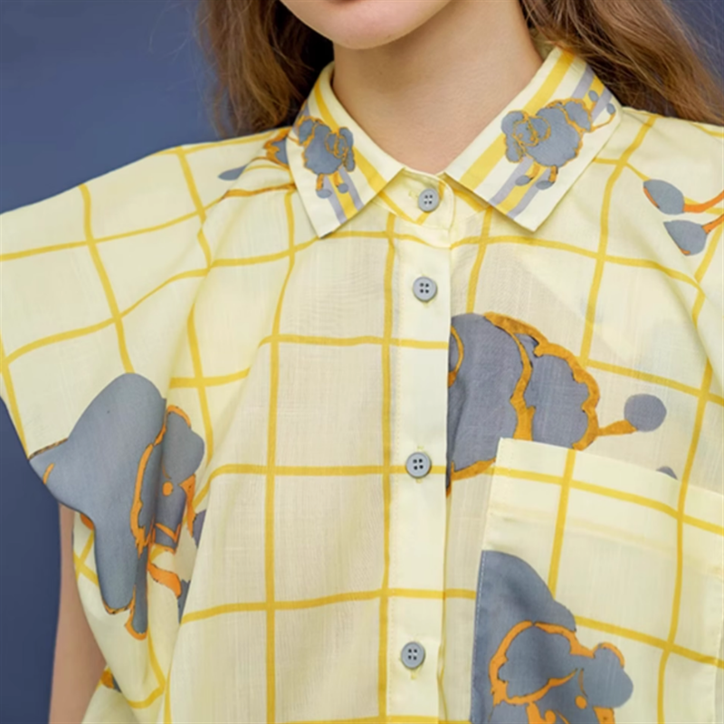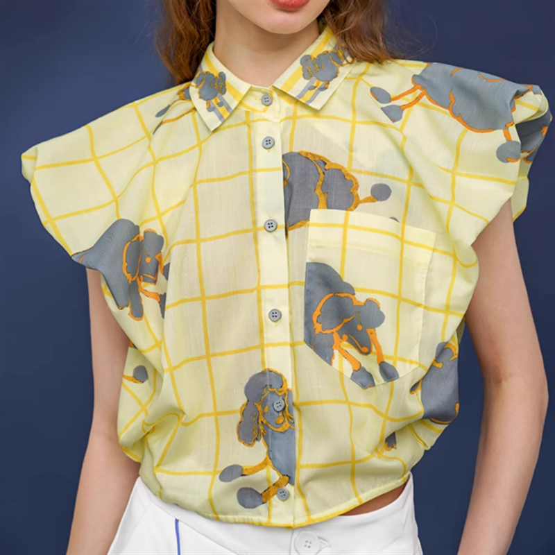 爽やかなイエローチェック柄に、ヒツジのイラストが可愛らしいブラウスです