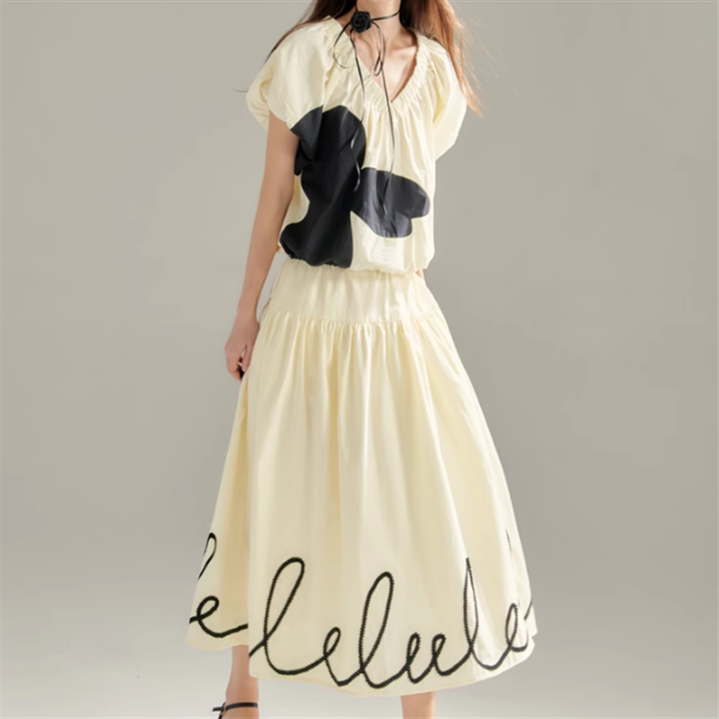 ボリュームスリーブ、裾にはドロストデザインにより全体的に丸いシルエットが可愛らしいトップスです。
