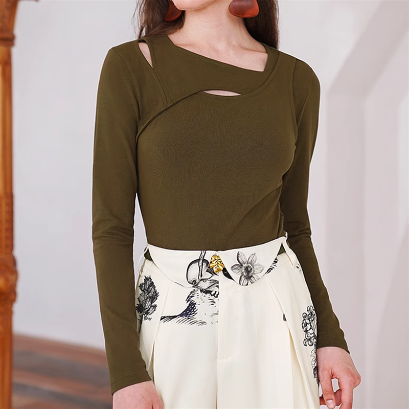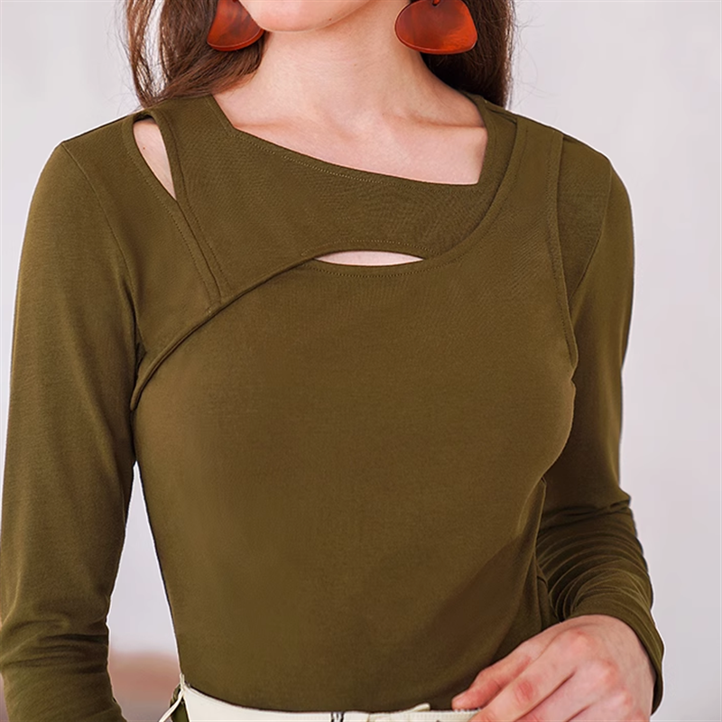 ヘルシーな肌見せを実現する変形デザインで、スリムなシルエットが女性らしさを引き立てます。