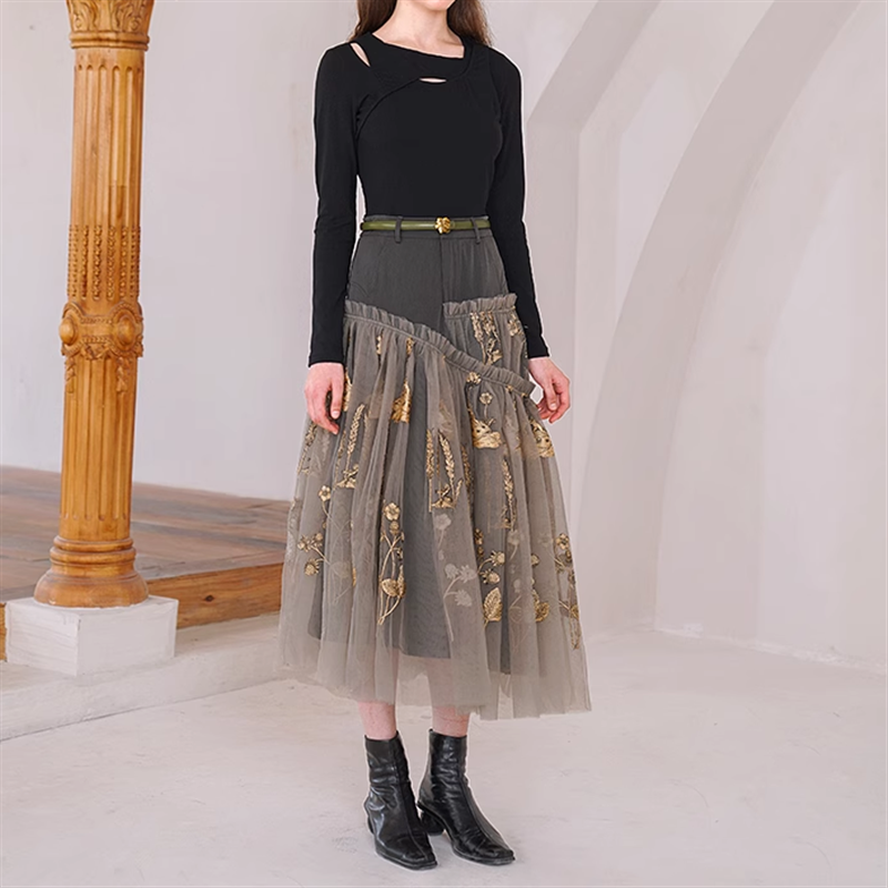 植物モチーフの刺繍が施されたチュールを重ねた繊細なデザイン。