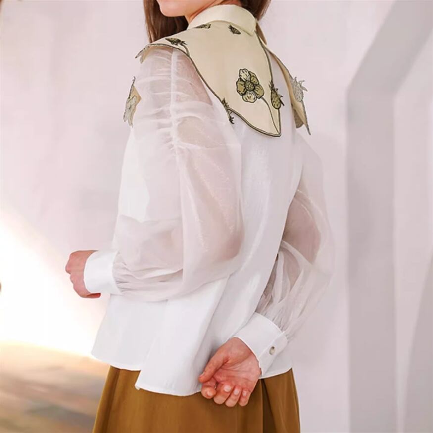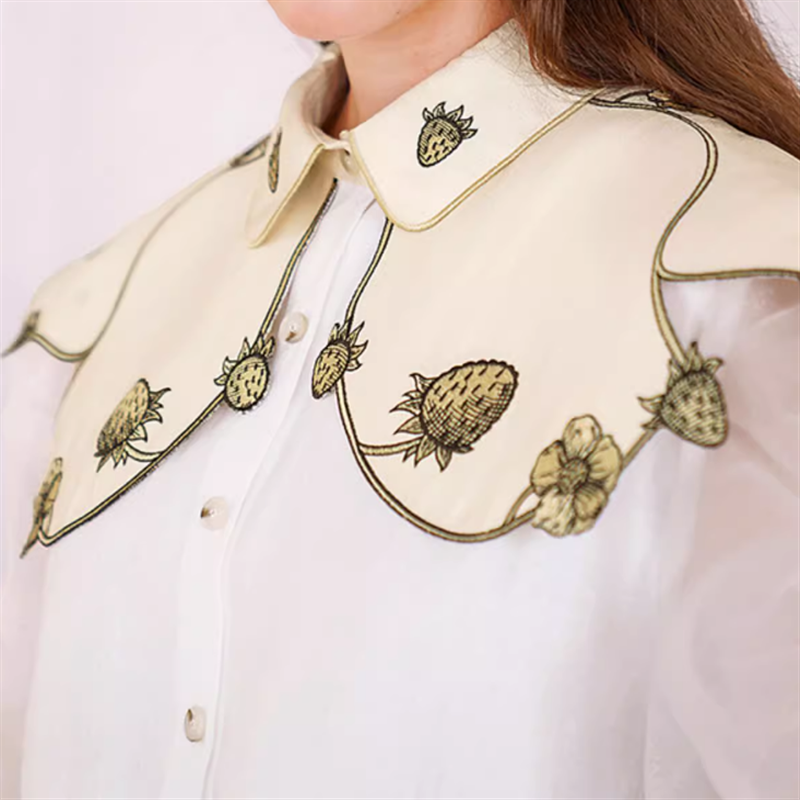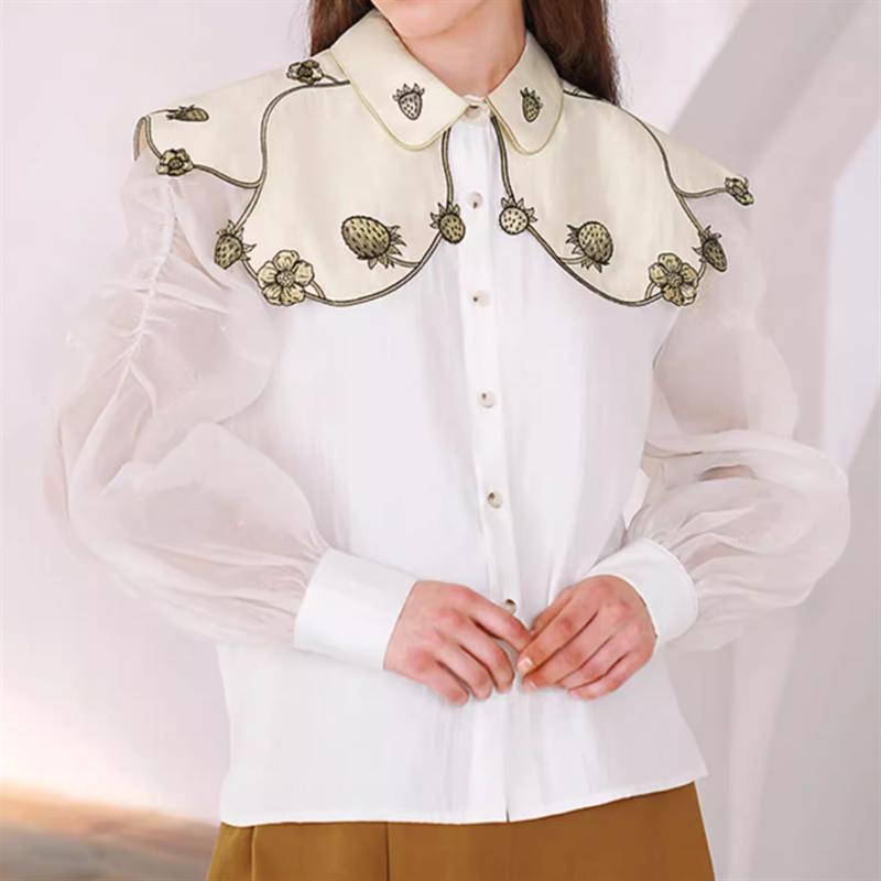 イチゴの刺繍が施された大きな襟が目を引くクラシカルなブラウスです。