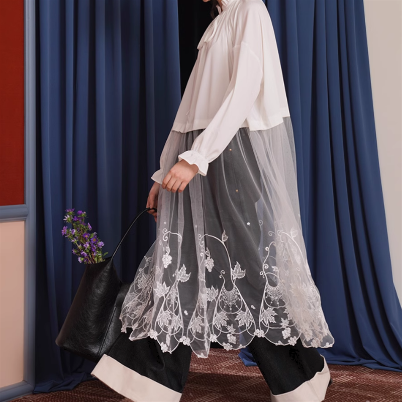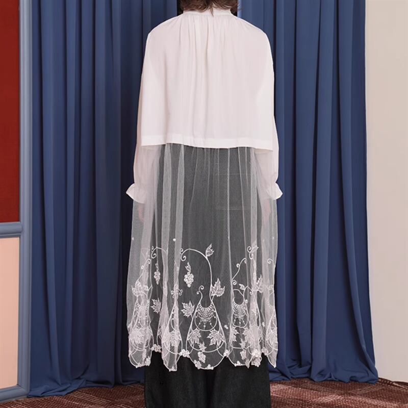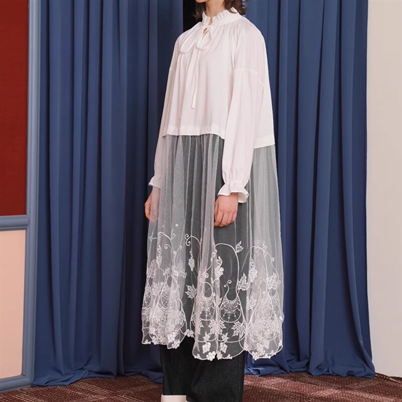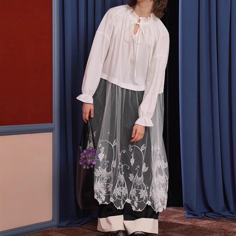 軽やかな透け感がにレースデザインが魅力のロング丈ブラウスです。