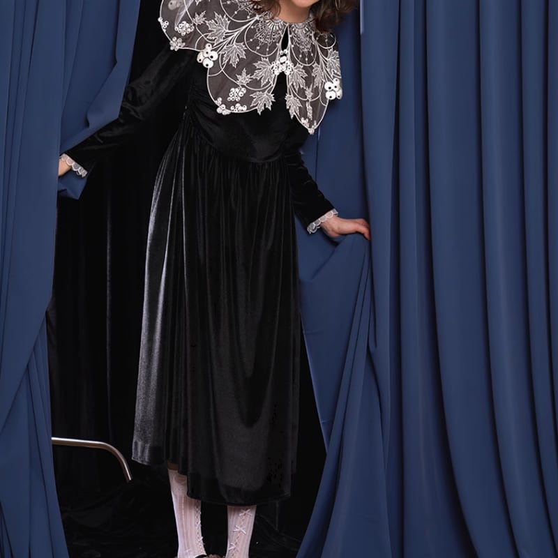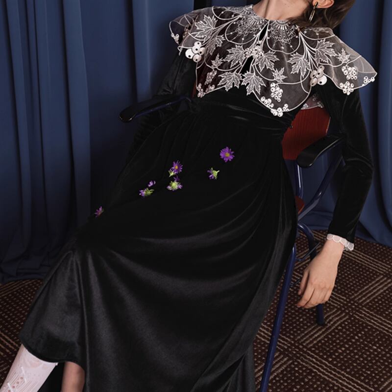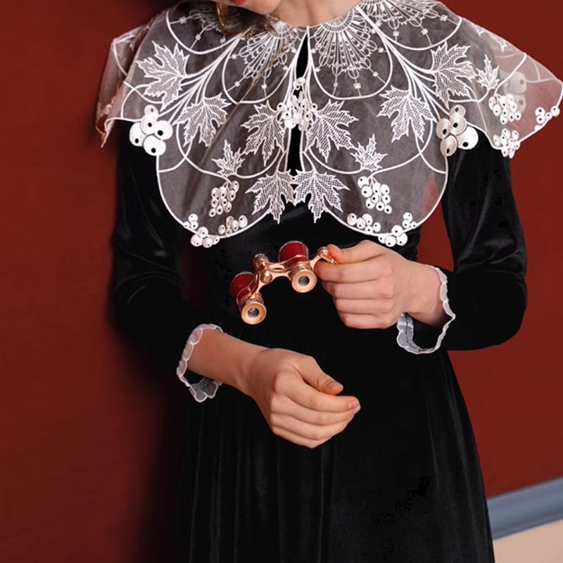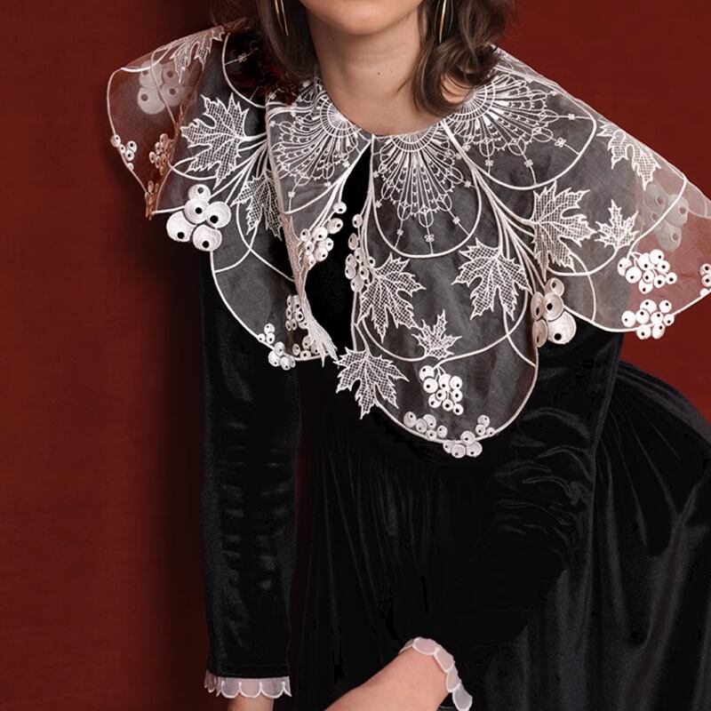 目を引く大きな襟は透け感と繊細なレース刺繍がポイント。
