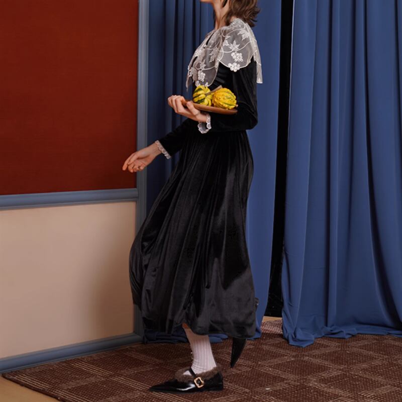 ベルベット調の艶やかな生地がクラシカルな印象のロングワンピースです。