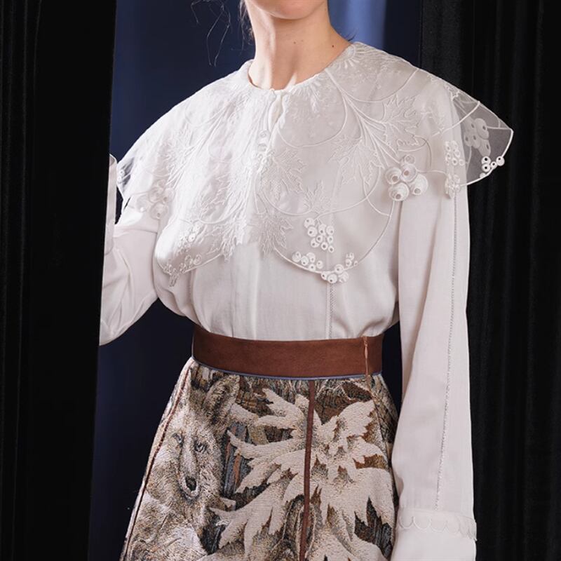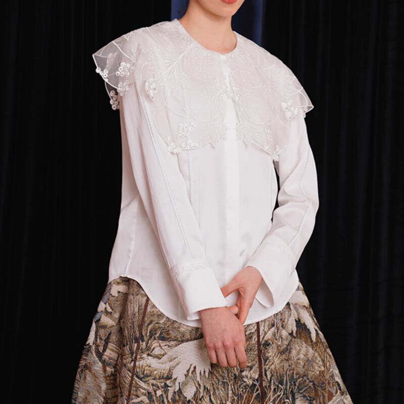 存在感のある大きな襟が特徴の美しいブラウスです。