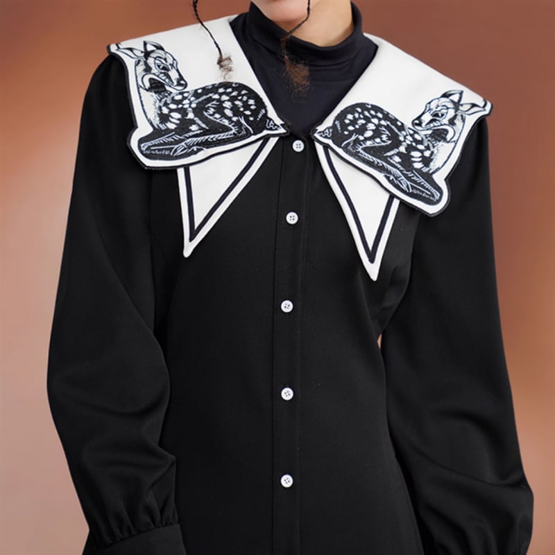 可愛らしい小鹿の刺繍が施された襟が特徴のワンピースです。
